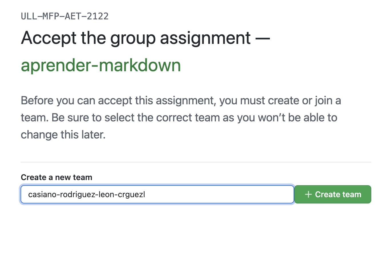 Esta tarea inicial ha sido configurada por el profesor como una tarea de equipo. Eso significa que cuando hagan click en la aceptación de la tarea les saldrá un formulario para elegir el nombre del equipo. En este caso el equipo será individual.